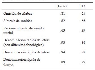 Con el fin de identificar qué habilidades se constituyeron como predictores de la escritura de palabras con correspondencias dependientes del contexto e inconsistentes y con el aumento de la velocidad en la lectura de palabras, se llevaron a cabo regresiones por pasos sucesivos. Para ello, previamente, se exploró la posibilidad de obtener una medida unificada a partir de las distintas pruebas de conciencia fonológica y de denominación rápida. Se calcularon una serie de correlaciones entre las pruebas. Dado que los resultados señalaron la existencia de correlaciones entre las tres medidas (r = .478 y p = .005 entre síntesis de sonidos y omisión de sonidos y sílabas; r = .394 y p = .005 entre omisión de sonidos y sílabas y sonidos inicial, y r = .433 y p = .005 entre reconocimiento de sonido inicial y síntesis de sonidos). Estas se cargaron a un único factor denominado conciencia fonológica que en el análisis exploratorio explicó un 55.81% de la variancia total de las pruebas. En el caso de las pruebas de denominación rápida, dadas también las altas correlaciones existentes entre las tres medidas (r = .689 y p = .001 entre la prueba tradicional y la prueba de dígitos; r = .795 y p = .001 entre la prueba de dígitos y la prueba alternativa, y r = .783, p = .001 entre la prueba alternativa y la prueba tradicional), se las cargó a un único factor denominado denominación rápida que en el análisis exploratorio explicó un 84.05% de la variancia total de las pruebas. En la tabla 4 se expresan la carga factorial y las comunalidades de los factores, denominados conciencia fonológica y denominación rápida.