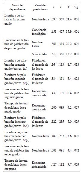 En cada una de las regresiones se introdujo una de las pruebas de escritura (de correspondencias inconsistentes o dependientes del contexto) y precisión y tiempo de lectura de palabras de los grados segundo y tercero como variable dependiente (salvo a fin de primer grado, que se introdujo en la medida de escritura sin disociar entre tipos de correspondencias por haberse perdido las correlaciones). Las variables independientes introducidas fueron las habilidades de denominación rápida, conciencia fonológica, fluidez en el trazado de las letras, conocimiento de las letras y atención visual, administradas a principio de primer grado, por lo que se obtuvieron predictores longitudinales de las medidas de aprendizaje ortográfico de fin de segundo y tercero (tabla 5).
