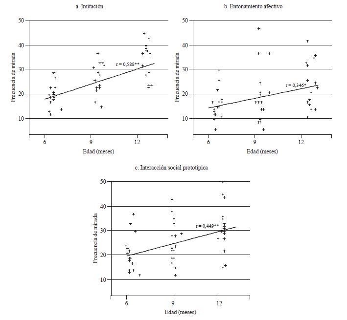 En la figura 1 se observa la relación entre la frecuencia de mirada dirigida a la experimentadora y la edad de los bebés en cada una de las condiciones de interacción (cada punto representa la frecuencia de mirada de cada bebé participante en la sesión de interacción específica). En el caso de las sesiones de interacción con imitación, se constata que la frecuencia aumenta con la edad de los bebés, con un coeficiente de correlación r = 0,588 (p < 0,01). El promedio de veces en las que el bebé miró a la experimentadora en las sesiones de interacción con imitación a los 6 meses fue de 19,1 veces, llegando a las 31,8 veces en las correspondientes a los 12 meses. Por su parte, en la condición de interacción con entonamiento afectivo la correlación con la edad es también positiva pero de menor fuerza, con un coeficiente de correlación r = 0,346 (p < 0,05). Finalmente, la condición de control (interacción social prototípica) también muestra un aumento en la cantidad de veces que el bebé fijó su mirada en la experimentadora pero con un nivel de asociación intermedio respecto a las dos condiciones recientemente presentadas (r = 0,449; p < 0,01).