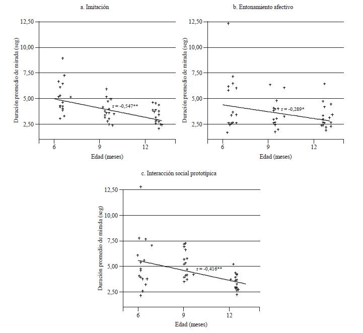 Por último, en la interacción social prototípica se advierte una tendencia de igual sentido que para las dos condiciones previas, con una intensidad en la relación intermedia, donde r = ‑0,416 (p < 0,01) (figura 2c). Las duraciones de mirada para esta condición fueron levemente más largas que para las demás condiciones de interacción, siendo en promedio de 5,2 segundos a los 6 meses y de 3,3 segundos a los 12 meses de edad.
