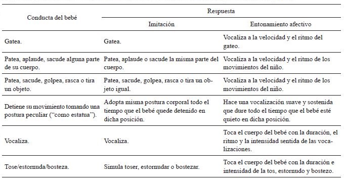 La condición de interacción con entonamiento afectivo comenzó con 3 minutos de juego libre para establecer un “buen clima” de interacción. Luego continuó con 5 minutos durante los cuales la experimentadora ejecutó conductas en las que hizo coincidir la cantidad, la intensidad y la pauta temporal de la conducta del bebé, pero en una modalidad conductual diferente. Por ejemplo, cuando el bebé vocalizó, la experimentadora le hizo toques en el cuerpo; cuando el bebé realizó movimientos corporales, la experimentadora respondió con vocalizaciones. Por último, se establecieron 2 minutos de cierre con juego libre. En la tabla 1 se resumen las respuestas de la experimentadora a las conductas del bebé en las condiciones de interacción con imitación y de interacción con entonamiento afectivo.