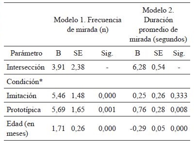Se realizaron dos modelos de regresión: uno utilizando como variable dependiente a la frecuencia de miradas dirigidas a la experimentadora por sesión de interacción y el otro utilizando como variable dependiente la duración promedio de cada mirada. En ambos casos las variables independientes utilizadas fueron edad y condición de interacción, tomando el entonamiento afectivo como condición de referencia para el modelo. No fueron incorporadas al modelo la variable sexo, así como las interacciones entre edad y sexo, edad y condición, y condición y sexo, dado que no mostraron ser significativas (Sig. < 0,010). En la tabla 2 se presentan los resultados correspondientes.