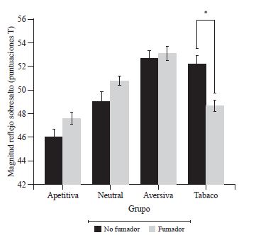 Las investigaciones que han estudiado la modulación del reflejo de sobresalto ante estímulos asociados al tabaco han mostrado diferentes resultados. Por ejemplo, Cinciripini et al. (2006) y Dempsey, Cohen, Hobson y Randall (2007) encontraron que los fumadores inhiben el reflejo de sobresalto ante imágenes asociadas al tabaco; esto sugiere la activación del sistema motivacional apetitivo, lo que a su vez se relaciona con conductas de aproximación, sin embargo, también se han encontrado resultados contradictorios utilizando esta misma metodología y población (Muñoz et al., 2010). Otros estudios han mostrado diferencias en el reflejo de sobresalto según el grado de dependencia a la nicotina y el nivel de consumo de tabaco (Cui et al., 2012; Rehme et al., 2009), pero entre estos estudios también hay contradicciones.