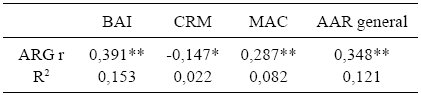En la tabla 3 se presentan las correlaciones entre la medición del ARG, las dimensiones específicas y la medición general del AAR. Todas las asociaciones fueron significativas, tanto las relaciones entre el ARG y BAI como entre el ARG y el AAR general llegaron a ser moderadas; la asociación entre el ARG y MAC y la relación negativa entre el ARG y CRM fueron leves. Los coeficientes de determinación muestran tamaños de efectos pequeños.