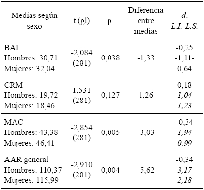 Como se muestra en la tabla 4, al considerar las diferentes variables sociodemográficas se encontró un efecto del sexo sobre las dimensiones BAI, MAC y en la medida general del AAR; no hubo diferencias significativas según sexo en CRM. En todas las diferencias significativas las medias femeninas (n = 149) fueron superiores a las masculinas (n = 134), el estadístico d de Cohen muestra un tamaño del efecto leve en todos los casos. La figura 1 presenta estos resultados.
