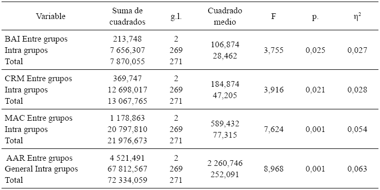 Las pruebas post hoc de Tukey mostraron que al considerar la dimensión BAI las familias con sólo la madre presente y el padre manteniendo contacto (M = 33,39; DT = 4,79) puntuaron significativamente más alto que las familias con presencia de ambos padres biológicos (M = 30,93; DT = 5,61) (p = 0,026); no existió otra diferencia significativa entre grupos en esta dimensión. Al tomar en cuenta las CRM, la prueba post hoc no evidenció ninguna diferencia significativa entre grupos, por lo que el efecto significativo encontrado en el Anova no apareció al hacer las comparaciones posteriores entre grupos.