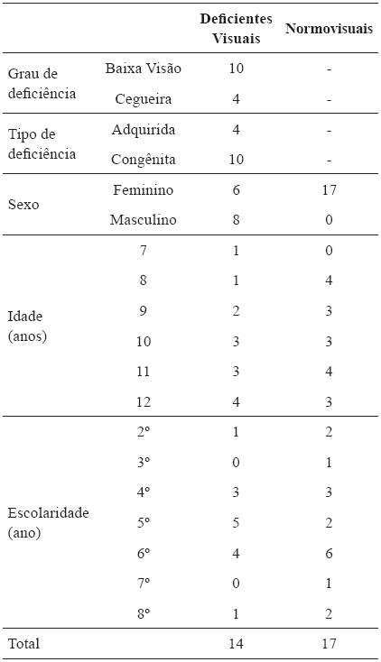 Participaram 31 crianças, divididas em dois grupos (deficientes visuais e normovisuais), sendo 14 crianças deficientes visuais (m = 10,28 anos; DP = 1,58), e 17 crianças normovisuais (m = 9,94 anos; DP = 1,43). Como critério de inclusão, os participantes deveriam possuir entre 7 e 12 anos, de ambos os sexos, sendo pareados em relação à escolaridade. Informações referentes ao grau e o tipo de deficiência, sexo, idade e ano escolar são fornecidas na tabela 1.