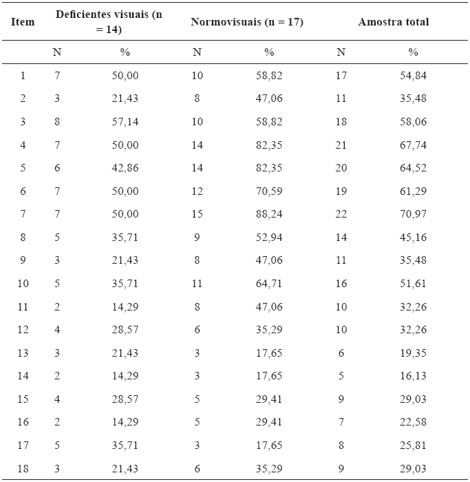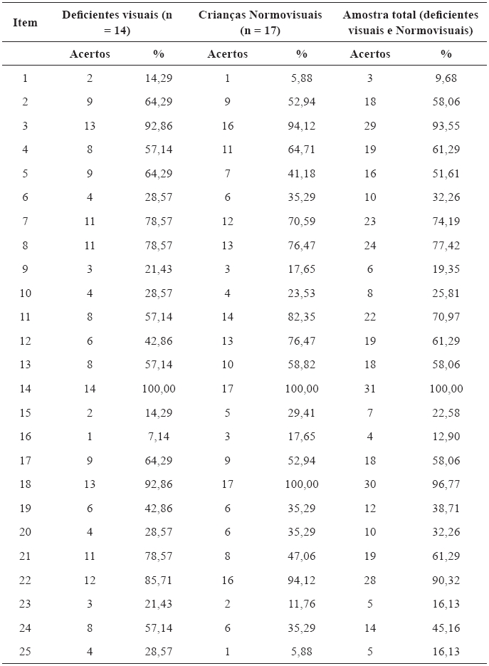Pode-se observar que alguns itens obtiveram mais acertos, de modo que os mesmos podem ser considerados, pelo menos nesse estudo exploratório inicial, como itens de dificuldade baixa, como, por exemplo, o item 14, com 100 % de acerto em ambas as amostras e os itens 3, 18 e 22, com porcentagem de acertos acima de 90 %, independente do grupo considerado. Nestes itens também é possível notar que as crianças normovisuais obtiveram médias maiores do que as deficientes visuais. Por outro lado, crianças normovisuais obtiveram menor desempenho nos itens 1 e 25, ambos com 5,88 % de acertos.