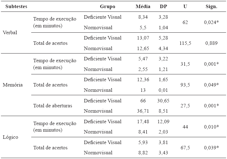 Ainda que as análises tenham sido realizadas, deve-se inferir que estes resultados referem-se a esta amostra reduzida de crianças (n = 31), o que limita uma compreensão generalizada dos resultados, de modo que os mesmos devem restringir-se à amostra em questão. Ainda de acordo com a tabela 4, a influência da variável grupo (crianças normovisuais x crianças com deficiência visual) mostrou-se significativa em todos os subtestes considerados. No subteste Verbal as crianças normovisuais executaram a atividade em menos tempo (cinco minutos e 50 segundos) do que as crianças deficientes visuais (8’34”), sendo esta diferença significativa (u = 62; z = -2,26; p = 0,024).