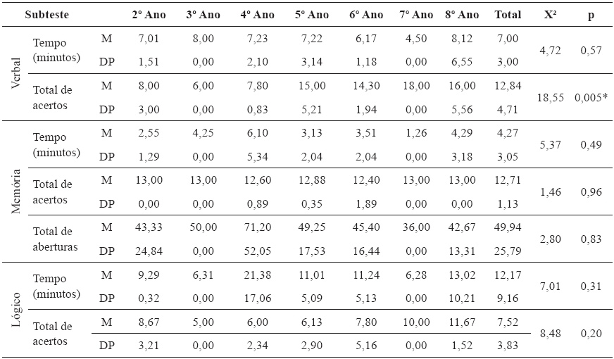 Ressalta-se o fato de que, quando o grupo foi dividido por escolaridade, alguns anos escolares foram preenchidos por apenas uma criança (dp = 0.00), o que implica que estes resultados sejam vistos considerando esta limitação. Os resultados foram significativos no subteste “Raciocínio Verbal”, em relação ao total de acertos (h(6) = 18,55, p≤0,005). Crianças com escolaridade correspondente ao 7º ano foram as que obtiveram mais acertos no subteste (m = 18,00), comparadas com a média dos outros anos escolares. É interessante observar também que as crianças do 8º ano também tiveram, em média, comparadas com os demais grupos, um desempenho mais elevado (m = 16,00). Pode-se observar, ainda, que a partir do 5º ano, o desempenho médio das crianças é mais elevado do que as médias dos outros anos escolares (2º, 3º e 4º anos).
