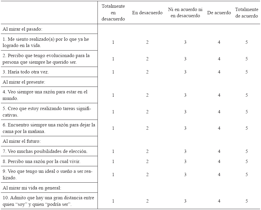 Escala de percepción ontología del tiempo (EPOT). Teniendo por base la concepción de temporalidad de Frankl (1988, 1989) y Lukas (1990a), Aquino (2009) desarrolló esta medida. Su propósito ha sido evaluar la percepción del ser con respecto al pasado (al mirar el pasado: me siento realizado(a) por lo que ya he logrado en la vida), presente (al mirar el presente: veo siempre una razón para estar en el mundo) y futuro (al mirar el futuro: veo muchas posibilidades de elección), reuniendo tres ítems en cada dimensión temporal, además de un ítem que ofrece una evaluación global de la vida (índice de congruencia del self: admito que hay una gran distancia entre quien “soy” y quien “podría ser”). Los ítems son dispuestos en una escala de respuesta de 5 puntos, con los extremos 1 (totalmente en desacuerdo) y 5 (totalmente de acuerdo). Realizando un análisis factorial confirmatorio, este autor verificó índices de ajuste adecuados para la estructura trifactorial: χ² /gl = 1,89, RMSEA = 0,054, GFI = 0,97, AGFI = 0,94 y CFI = 0,98.