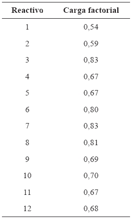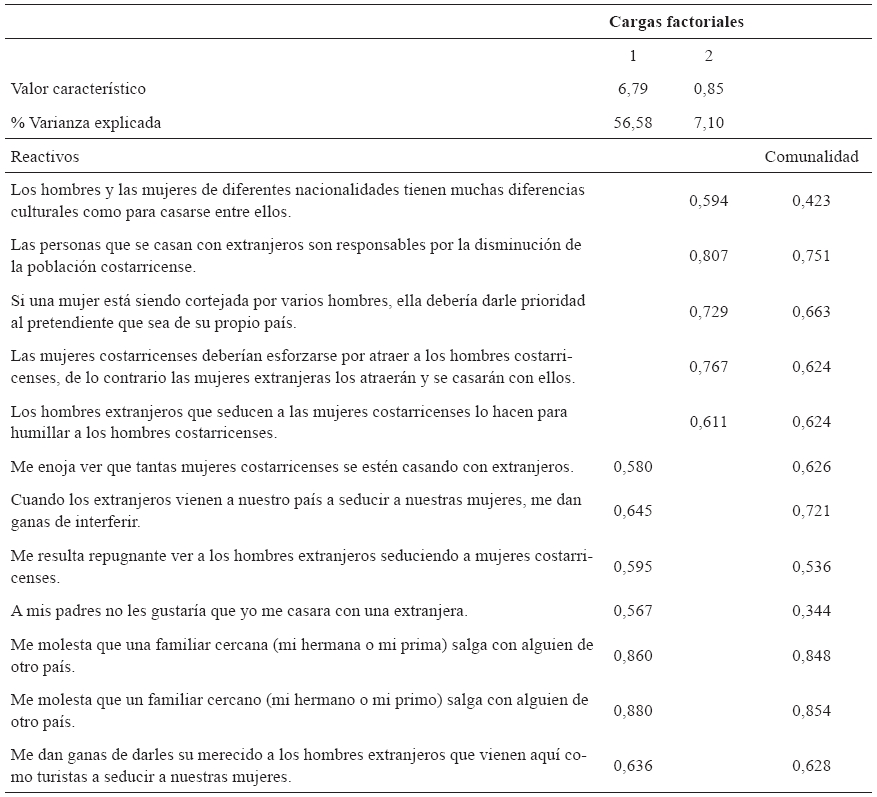 Estructura. Un análisis de factores exploratorio mediante factorización de ejes y rotación Varimax (tabla 1) evidenció la idoneidad de muestral para llevar a cabo el análisis (KMO = 0,891, Bartlett Chi-Cuadrado (χ2) = 1818,79, gl = 66, p ˂ 0,001. Los resultados indican la presencia de dos factores con valores característicos mayores a uno, que en su conjunto explicaron un 69,41 % de la varianza total. El primer factor, compuesto por siete ítems, presentó un valor característico de 7,12 y explicó un 59,36 % de la varianza. Los reactivos que componían este factor reflejan las reacciones típicas ante la que representan miembros de exogrupo como celos, rivalidad y necesidad de confrontación (“Me resulta repugnante ver a los hombres extranjeros seduciendo a mujeres costarricenses) y consecuentemente fue denominado “amenaza”. El segundo factor, compuesto por cinco ítems presentó un valor característico de 1,20 y explicó un 10,04 % de la varianza (tabla 1). Los ítems que componían este factor expresaban la desaprobación social y las consecuencias negativas para la sociedad si se promueven las relaciones entre nacionales y extranjeros (“Las personas que se casan con extranjeros son responsables por la disminución de la población costarricense”) y, por lo tanto, se denominó “desaprobación normativa”. Ahora bien, es importante hacer notar que el primer factor explica por sí solo el 60 % de la varianza de los reactivos, donde se observa una importante caída en el valor característico del primer al segundo factor, y que una inspección de la matriz de componentes no rotados evidenció que todos los ítems presentaron cargas factoriales altas en el primer factor previo a la rotación. Todo eso hace pensar que los reactivos se inclinan a covariar en una sola escala unidimensional.