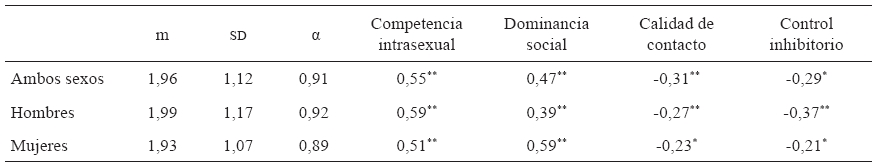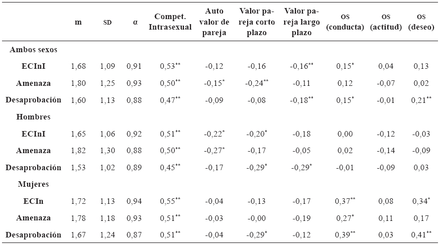En el caso de los hombres, se observó una correlación positiva significativa de la ECInI con la competencia intrasexual general (r = 0,51, p < 0,001) y correlaciones negativas con el valor autoasignado como pareja (r = -0,22, p = 0,025) y el valor asignado a potenciales parejas a corto plazo (r = -0,20, p = 0,043). En el caso de las mujeres, se encontraron correlaciones positivas y significativas entre las puntuaciones de la ECInI y las puntuaciones en competencia intrasexual general (r = 0,55, p < 0,001) y los aspectos conductuales (r = 0,37, p < 0,001) y de deseo (r = 0,34, p = 0,001) de la orientación sociosexual.