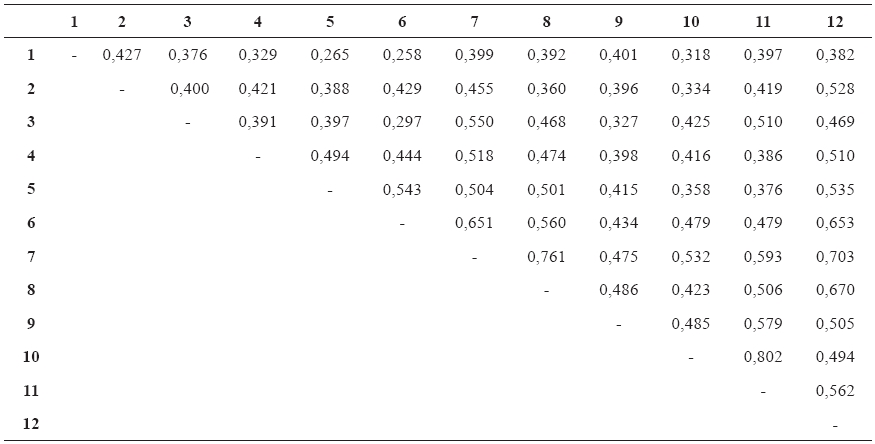 La estimación de los modelos se realizó sobre la base de la matriz de covarianzas de los ítems utilizando el método de máxima verosimilitud (Maximum Likelihood). El ajuste de los modelos fue evaluado con tres índices: el índice de ajuste comparativo (CFI), la raíz cuadrada del error de estimación (RMSEA) y el Chi-Cuadrado (χ2). Estos índices proveen información acerca de la discrepancia entre la matriz de varianzas/covarianzas propuesta por el modelo teórico y la matriz de varianzas/covarianzas empírica (Hu & Bentler, 1995). La matriz de varianzas y covarianzas se presenta en la tabla 3.