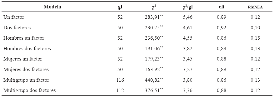 Invariancia de la estructura factorial. Con el fin de estimar la invariancia de la estructura de la escala en hombres y mujeres se ajustaron los dos modelos para hombres y para mujeres por separado y, posteriormente, se llevó a cabo un análisis multigrupo para cada una de las dos estructuras modeladas. En todos los casos solamente las cargas factoriales se fijaron a la igualdad (invariancia débil).