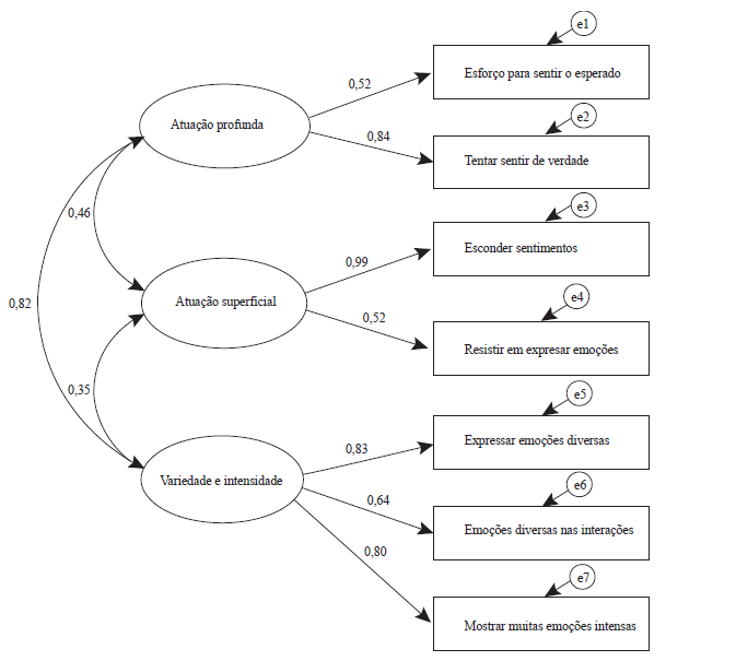 A análise da ELS apresentou uma estrutura de três fatores, explicando 58,3 % da variância (α = 0,80), com cargas fatoriais variando de 0,59 a 0,98. O primeiro fator reuniu itens referentes às dimensões variedade e intensidade. Essa composição já havia sido apontada por Botheridge e Lee (2003) nos testes de validação da escala, interpretado como algo derivado da possível dificuldade de distinção dessas diferentes facetas da vivência emocional. Portanto, o fator foi nomeado de variedade e intensidade das emoções (três itens, α = 0,80). O segundo fator abarcou os itens referentes à estratégia de atuação profunda (dois itens, α = 0,69), recebendo essa mesma denominação. O terceiro fator reuniu os itens de estratégia de atuação superficial (dois itens, α = 0,70). Essa estrutura fatorial foi submetida à AFC no Grupo-Teste, apresentando excelentes índices de ajustamento, sem necessidade de reespecificações: χ2/gl = 2,41, p < 0,001; RMSEA = 0,07; SRMR = 0,05; CFI = 0,97; e TLI = 0,95.