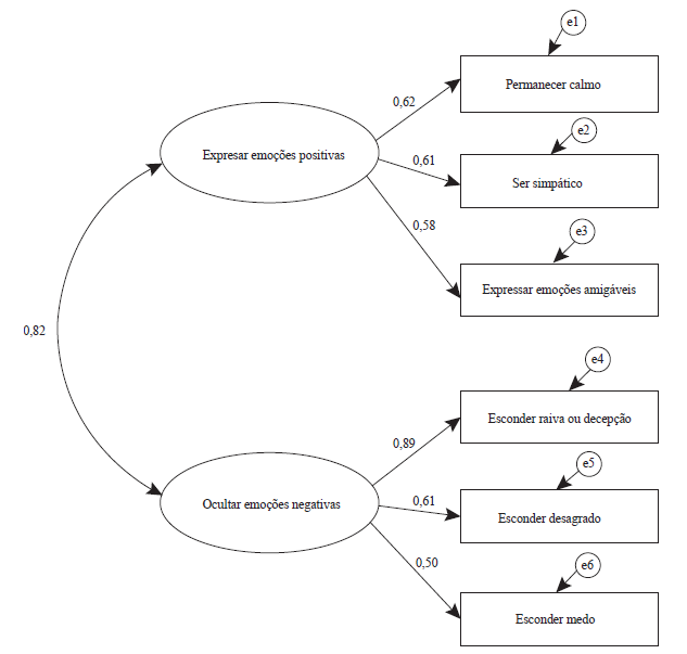 A AFE realizada com a EWRS apresentou uma estrutura de dois fatores com seis itens, explicando 43 % da variância (α = 0,70). As cargas fatoriais oscilaram entre 0,45 e 0,90. No primeiro fator, demanda de expressão de emoções positivas, saturaram três itens referentes à exigência de expressar emoções positivas no cotidiano de trabalho (α = 0,736). No segundo, nomeado de demanda de ocultação de emoções negativas, saturaram três itens referentes à necessidade de esconder emoções negativas como parte do trabalho (α = 0,70). Essa estrutura fatorial foi submetida à AFC no Grupo-Treino, apresentando excelentes índices de ajustamento, também sem a necessidade de reespecificações: χ2/gl = 1,29, p < 0,001; RMSEA = 0,05; SRMR = 0,05; CFI = 0,97; e TLI = 0,95. Por fim, no caso da subescala de exaustão emocional (MBI-HSS), os nove itens de sua estrutura unifatorial mostraram alta consistência interna (α = 0,92).