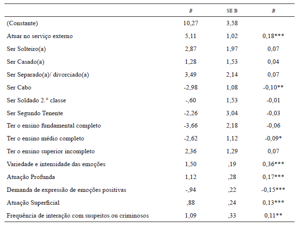 Como se nota pela tabela 1, entre as variáveis-controle, os indicadores de exaustão emocional foram preditos principalmente pelo trabalho no setor externo (β = 0,18). A frequência da interação também prediz a exaustão, embora em menor grau (β = 0,11). Quanto aos fatores do trabalho emocional, o modelo revelou que, quanto mais diversos e intensos os afetos vivenciados pelos policiais militares, maior a tendência de exaustão emocional (β = 0,36). Ambas as atuações, profunda (β = 0,17) e superficial (β = 0,13) à predizem os indicadores de burnout, sugerindo que, independente da estratégia usada, ela tem impactos negativos para o policial. A demanda percebida quanto à necessidade de expressar emoções positivas como parte do trabalho policial está associada à redução de indicadores de exaustão emocional (β = - 0,15).