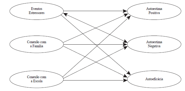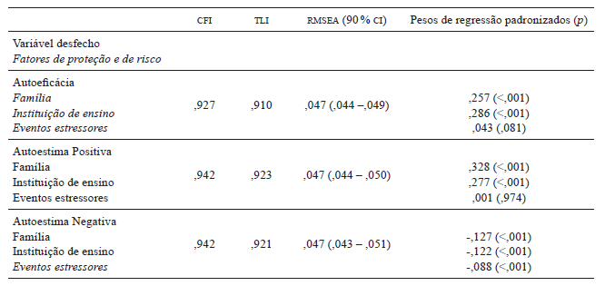 Ao testar-se o modelo, as variáveis “conexão com a família” (peso de regressão = 0,257) e com a “instituição de ensino” (peso de regressão = 0,286), apresentaram associação positiva com autoeficácia (tabela 5). Em relação à autoestima positiva, as variáveis “conexão com a família” (peso de regressão = 0,328) e com a “instituição de ensino” (peso de regressão = 0,277), estiveram positivamente associadas à autoestima positiva. Quanto à autoestima negativa, as variáveis “conexão com a família” (peso de regressão = -0,127) e com a “Instituição de ensino” (peso de regressão = -0,122), apresentaram associações negativas com autoestima negativa. A variável “eventos estressores” apresentou uma relação negativa (peso de regressão = -0,088), porém baixa com autoestima negativa (tabela 5).