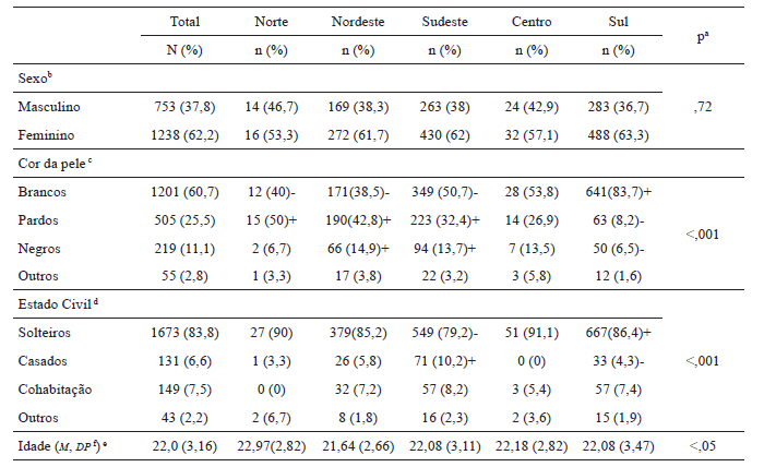 Quanto aos dados sociodemográficos (tabela 1), a distribuição de participantes nas 5RB ficou entre 38 % e 46,7 % para o sexo masculino, e entre 53,3 % e 63,3 % para o sexo feminino. Anovas (Análise de Variânça) com testes Post hoc Bonferroni não encontraram diferenças significativas em relação às idades dos participantes nas 5RB. Na amostra total, teve-se 60,7 % jovens de cor branca, 25,5 % de cor parda, 11,1 % de cor preta e 2,8 % se declararam de outras cores [χ2 (12, N = 1980) = 311,2; p<0,001]. As diferenças estatisticamente significativas foram encontradas quanto à frequência superior de jovens da cor branca na região Sul, em relação ao Sudeste e Nordeste; e frequência inferior de jovens pardos e negros na região Sul, em relação às regiões Norte, Nordeste e Sudeste. Observou-se também, nas regiões Norte, Nordeste e Sudeste em relação à região Sul, número superior de pardos.
