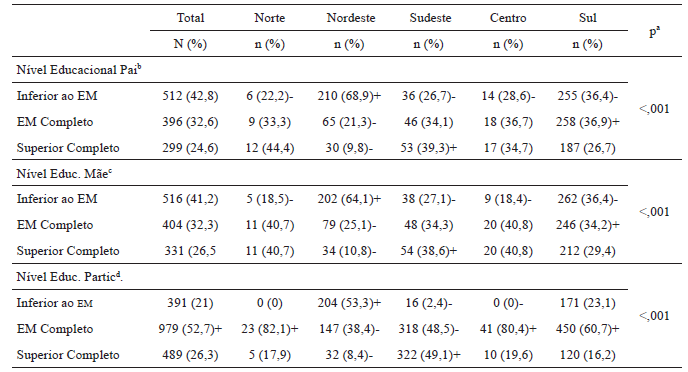 Quanto ao nível educacional dos pais e mães (tabela 2), foram observadas porcentagens superiores de jovens cujos pais [χ2 (8, N = 1 216) = 130,77; p<0,001] e mães [χ2 (8, N = 1251) = 113,48; p<0,001] possuem nível educacional inferior ao Ensino Médio na região Nordeste, em relação às demais regiões; e porcentagens inferiores de Ensino Médio completo na região Nordeste, em relação à região Sul; e porcentagens inferiores de Superior completo na região Nordeste, em relação à região Sudeste.