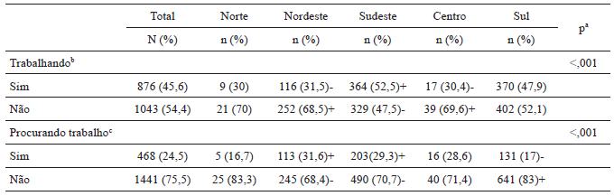 Quanto à variável “procurando trabalho”, foram identificadas frequências superiores de jovens em busca de trabalho nas regiões Nordeste e Sudeste, em relação à região Sul [χ2 (4, N = 1909) = 43,4; p<0,001].
