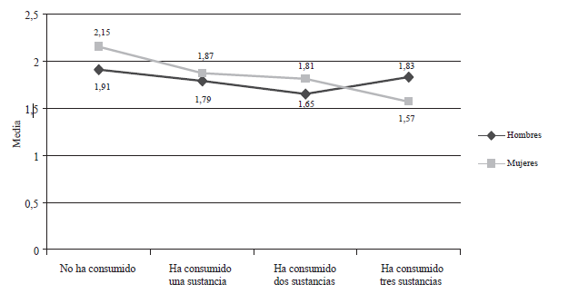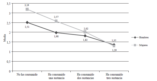 Por lo que respecta a los resultados de la muestra de Colombia, no se encontraron efectos significativos ni por sexo ni por indicador de consumo. Sin embargo, como se puede observar en la figura 2, las mujeres puntuaron ligeramente más alto que los varones, excepto en el grupo de los que informaron que han consumido las tres sustancias evaluadas; en cuanto al indicador de consumo, los adolescentes que indicaron que no han consumido presentaron un puntaje ligeramente mayor que los que han consumido algunas de las sustancias.