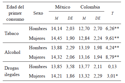 En cuanto a la edad del primer consumo de alcohol, tabaco y drogas ilegales, se realizaron pruebas t de Student para muestras independientes para determinar si había diferencias estadísticamente significativas entre los jóvenes de México y Colombia, dichos análisis se realizaron por sexo. Los resultados mostraron diferencias significativas en casi todos los análisis, los adolescentes hombres y mujeres de Colombia son quienes iniciaron a más temprana edad su consumo en los tres tipos de sustancias, en contraste con la muestra de México (tabla 2), excepto en la comparación de drogas ilegales en varones.