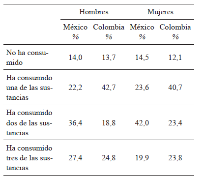 Para el consumo de drogas ilegales, los resultados mostraron que en el caso de los varones no se encontraron diferencias significativas por país, mientras que en las mujeres colombianas fue mayor el porcentaje que en las mexicanas (X2 = 6,51, p<0,05).