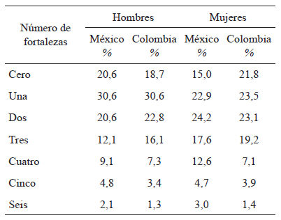 En la tabla 4 se pueden observar los resultados sobre la distribución del número de fortalezas en los hombres y mujeres de ambos países. En cuanto a la proporción de adolescentes que obtuvieron cero fortalezas externas, los resultados mostraron que fue mayor el porcentaje en los varones de México y en las mujeres de Colombia. Asimismo, se encontró que una mayor proporción de adolescentes presentaron de una a dos fortalezas externas, tanto los hombres como las mujeres de ambos países.