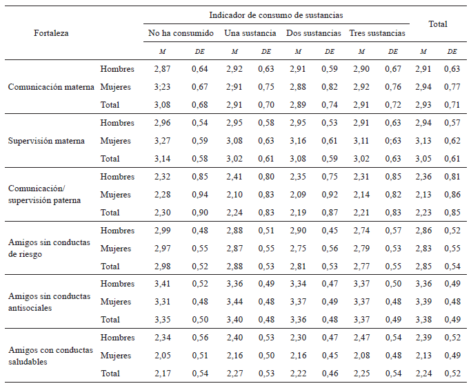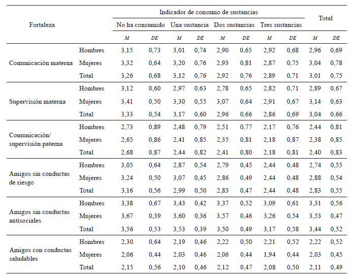 En las fortalezas de amigos sin conductas de riesgo y amigos sin conductas antisociales, los análisis de las pruebas de múltiples comparaciones indicaron que los jóvenes que han consumido tres sustancias tienen un mayor número de amigos con dichas conductas que los que han consumido un menor número de sustancias o no han consumido. En este mismo sentido, en la fortaleza de amigos sin conductas de riesgo, los resultados también mostraron diferencias significativas entre los jóvenes que han consumido dos sustancias y los que no han consumido o han consumido solo una sustancia. La interacción sexo por indicador de consumo no mostró diferencias significativas.