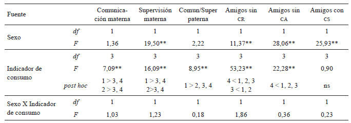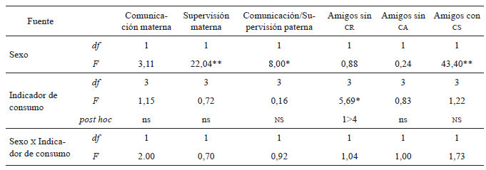 Los hallazgos mostraron que en la comunicación y en la supervisión de la mamá los adolescentes que no han consumido sustancias presentaron puntajes significativamente más altos que los que han consumido dos y tres sustancias; así mismo, los jóvenes que han consumido una sola sustancia también fueron significativamente diferentes a los que han consumido dos y tres sustancias. En la comunicación-supervisión paterna, los resultados de las pruebas post hoc mostraron que los adolescentes que no han consumido sustancias puntuaron significativamente más alto que los que han consumido (una, dos o tres sustancias), entre los demás grupos no se encontraron diferencias significativas.