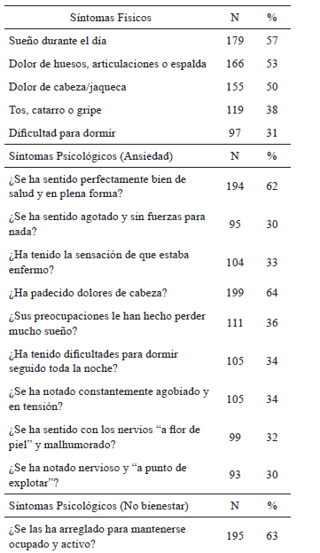 En respuesta a la escala de síntomas físicos se encontró que los síntomas que son reportados por el 30 % o más fueron: sueño durante el día, dolor de huesos, articulaciones o espalda, dolor de cabeza o jaqueca, tos, catarro o gripe y dificultad para dormir. Para los síntomas psicológicos, se obtuvo que los puntajes obtenidos en depresión fueron muy bajos, ningún síntoma de depresión se presentó en 30 % o más de los participantes. Las preguntas más resaltantes para el factor ansiedad, indican que el 62 % de los estudiantes manifiesta sentirse bien de salud y en plena forma, a pesar de que se reportan dolores de cabeza en un 64 %. Para la dimensión falta de bienestar psicológico, se tiene que más del 60 % de los encuestados refiere que se mantiene activo, satisfecho, con la impresión de que está haciendo las cosas bien, disfruta de sus actividades, es capaz de tomar decisiones y desempeña un papel útil en la vida (ver tabla 1).