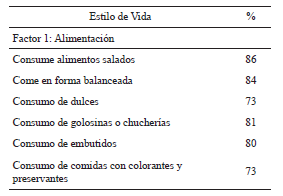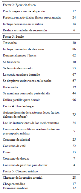 Por otra parte, en la escala de estilos de vida, por medio de un análisis de componentes principales realizado en el presente estudio, se identificaron cinco factores: alimentación, actividad física, hábitos de sueño, uso de drogas y chequeos médicos. Al evaluar la respuesta en cada ítem, se obtuvo en la muestra hábitos inadecuados de alimentación, frecuencia de actividad física muy baja, así como pocos chequeos médicos, aunque son más activos al implementar otras conductas preventivas. Por otro lado, el reporte de los hábitos de sueño coincide con los reportados en la escala de síntomas físicos, donde se encontró que los estudiantes presentan diferentes problemas de sueño. El factor con mejores resultados es el de consumo de drogas, que tiene una frecuencia muy baja, aunque un 75 % se automedica (tabla 2).