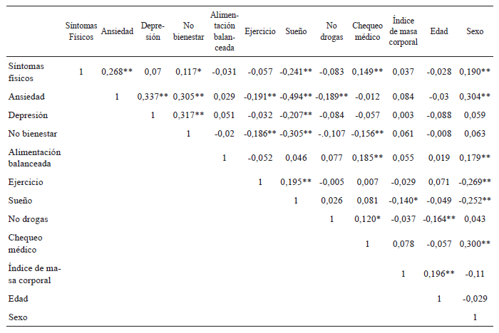 Resumen: Los posibles cambios en los estilos de vida que se producen al ingresar en la universidad, en conjunto con otros factores, impactan la salud, tanto física como mental, de los jóvenes y, por lo tanto, su desempeño académico y social. Es necesario, entonces, analizar la relación entre los estilos de vida y la salud en esta población. Así, el objetivo de esta investigación fue determinar la influencia del estilo de vida, el sexo, la edad y el índice de masa corporal sobre la salud física y psicológica de jóvenes universitarios, mediante una investigación explicativa con un diseño prospectivo único. Se usó una escala de estilos de vida, un Cuestionario de Salud General (GHQ-28), una escala de salud física y una hoja de identificación. Se evidenció que los 312 universitarios de la muestra, en general, gozan de buena salud. Reportan dificultades del sueño, gripe, dolor de huesos y cabeza. Presentan niveles bajos de depresión y malestar psicológico, con niveles moderados- bajos de ansiedad. Manifiestan hábitos inadecuados en alimentación, actividad física y chequeos médicos y, el consumo de drogas es bajo. Por medio de una regresión múltiple, se obtuvo que a mayor práctica de hábitos inadecuados de sueño y frecuencia de chequeos médicos mayores síntomas físicos. La mayor ansiedad se encuentra en mujeres, jóvenes con problemas de sueño y personas que consumen drogas. A menor edad y mayores problemas de sueño mayor depresión. El malestar psicológico se presenta con menor actividad física y problemas de sueño. Los resultados sugieren la conveniencia de crear programas de prevención en la universidad, tomando en cuenta los estilos de vida de los jóvenes.