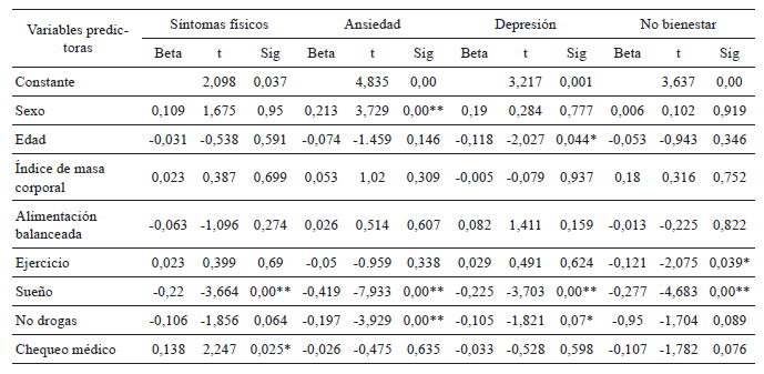 Como se puede ver en la tabla 4, los resultados de la regresión múltiple indican que a mayor estilo inadecuado en sueño y mayor frecuencia de chequeo médico mayores síntomas físicos. El presentar problemas de sueño, el ser mujer y el tener un mayor consumo de drogas se asocia con una mayor ansiedad. Tener problemas de sueño y poseer menor edad lleva a una mayor depresión, y, por último, poseer problemas de sueño y el tener baja actividad física conlleva a poco bienestar. El IMC y los hábitos alimentarios no explican alguna de las dimensiones de salud evaluadas. La ansiedad fue la dimensión más explicada.