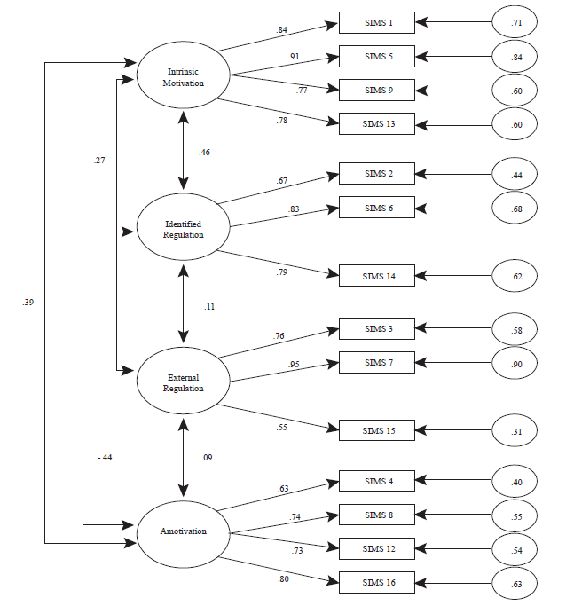 About construct validity, the results of the CFA support the four-factor structure, which reflects the theoretical constructs of amotivation, external regulation, intrinsic motivation, and identified regulation (Deci & Ryan, 1985). This result is consistent with other validation studies (e.g. Guay et al. 2000; Gillet et al., 2012, Martín-Albo et al. 2009; Standage & Treasure, 2002).