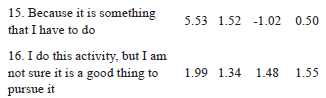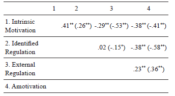 With respect to correlations between the different domains, the validation study carried out by Guay and colleagues (2000) revealed statistically significant positive correlation values between Intrinsic Motivation and Identified Regulation (r = .36, p <. 001), External regulation and Amotivation (r = .41, p <.01), and negative correlation values between Intrinsic Motivation and Amotivation (r = .41, p <.001).