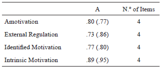 Regarding the internal consistency of the four subscales of the SIMS (table 2), the results surpass the threshold referenced in the literature (e.g. Hill & Hill, 2008), and showed values varying between .73 (External Regulation) and .89 (Intrinsic Motivation), and are very close to those obtained in the original study (Guay et al., 2000).