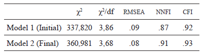 The new CFA for the final model (model 2) has better adjustment scores, although they can still be considered sufferable (χ2 = 260,981, p <.001, RMSEA = .08, NNFI =.91; Χ2/df = 3.68, CFI = .93). In table 5 we analyze the differences regarding goodness-of-fit between Model 1 and Model 2.