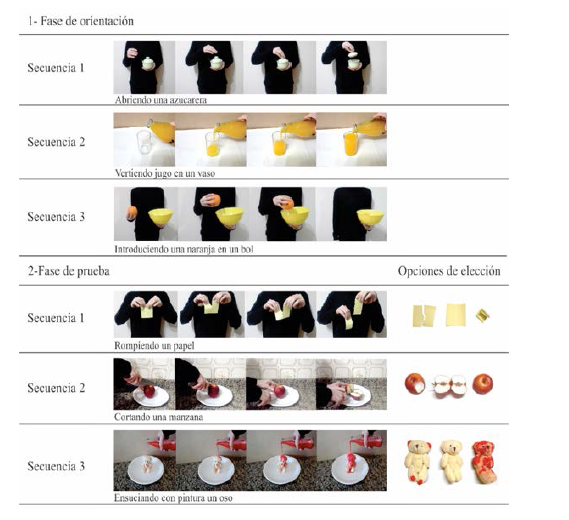 Orientación: En esta fase se presentaba a los niños tres secuencias de acciones en imágenes y mientras se mostraban las imágenes se les preguntaba “¿Qué está haciendo?”. Al finalizar la presentación se decía el resultado la acción (e. g. Secuencia 1: ¿Qué está haciendo?... viste como abrió). El propósito de esta fase era asegurarse de que los niños prestasen atención a la acción representada.