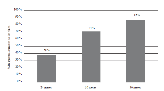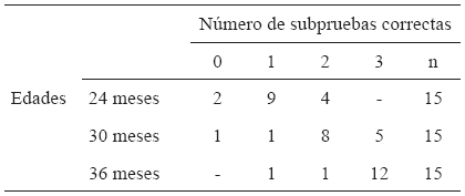 También se analizó el desempeño individual. A los 24 meses, cuatro niños respondieron correctamente dos subpruebas, nueve niños una y dos niños ninguna. A los 30 meses, cinco niños respondieron correctamente todas las subpruebas; ocho niños, dos; un niño, una y un solo niño, ninguna. A los 36 meses, once niños obtuvieron la puntuación máxima, dos niños resolvieron dos y un niño una (tabla 1).