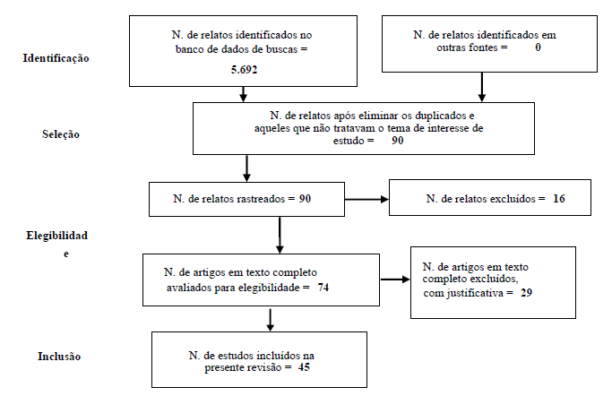 A Figura 1 apresenta o fluxograma da coleta e análise de dados. Como é possível observar, dos 90 artigos rastreados, 16 foram excluídos da amostra porque apenas citavam a expressão HSE na seção de referências, sem mencioná-la ao longo do texto. Dos 74 artigos elegíveis, 29 foram excluídos porque as HSE eram citadas, mas não eram o foco do estudo. Desta forma, o corpus desta pesquisa foi composto por 45 artigos que possuíam as HSE como foco do estudo e cujo texto completo encontrava-se disponível, os quais foram examinados a partir das categorias de análise adotadas.