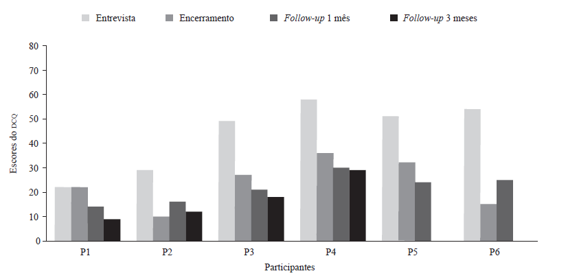 De acordo com o DCQ, usado para medir o medo ou fobia, quanto maior o escore, maior o índice de ansiedade e de preocupação em relação ao comportamento de dirigir. No presente estudo, os participantes apresentaram uma redução do escore após terem passado pelo programa de intervenção, com exceção de P1, que não apresentou alteração entre as sessões de entrevista inicial e de encerramento - o escore apresentado por ela (22) na sessão inicial era o menor em relação aos dos demais participantes. Infere-se que essa participante apresentava uma dificuldade na discriminação da ansiedade relacionada ao dirigir, principalmente antes de iniciar a psicoterapia. Taylor, Deane e Podd (2008) suportam essa inferência ao analisarem a relação entre ansiedade e a habilidade de dirigir, apontando a ocorrência de déficit na habilidade de avaliação e reconhecimento da ansiedade. Nas sessões de follow-up de 1 mês, houve uma redução no escore apresentado por quatro participantes (P1, P3, P4, P5). A exceção foram P2 e P6 que apresentaram escore superior ao da sessão de encerramento, mas na sessão de follow-up de 3 meses, P2 voltou a apresentar redução desse escore. Resultados semelhantes foram observados no estudo de Wald & Taylor (2003), no qual um dos participantes apresentou escore maior na sessão de follow-up de 1 mês, em relação ao pós-tratamento, e reduziu o escore na sessão de follow-up 3 meses. Os dados dos participantes P3, P4 e P5 são bastante semelhantes aos de Wald e Taylor, havendo redução progressiva nos escores nas sessões de pós-tratamento e de follow-up. Observa-se que esse dado é condizente com os comportamentos de enfrentamento dos participantes, que no início do tratamento não dirigiam, e durante a fase de intervenção passaram a dirigir.