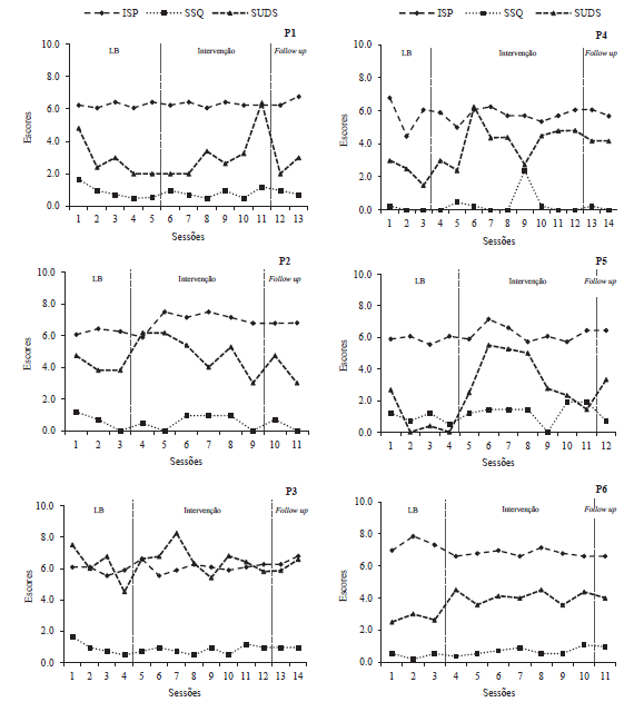 Os escores do ISP apresentam uma variação entre 4,5 a 7,9. Observa-se na figura 2 que: P6 manteve escores entre 6,6 e 7,9, o que pode ser considerado escore alto em relação aos demais participantes, e P4 apresentou escores 4,5 a 6,8 - os menores escores em comparação aos demais participantes. Os escores das sessões de follow-up se mantiveram relativamente constantes em comparação à última sessão de intervenção em todos os casos. Os participantes relataram que os estímulos e os cenários apresentados eram muito reais e próximos das situações que encontravam no cotidiano, e que isso contribuiu para que enfrentassem as situações de ter que dirigir fora da sessão. Quatro, dos seis participantes (P2, P3, P5 e P6), relatavam desejar dirigir o carro da família após exposição aos cenários virtuais, com intuito de praticar o que havia ocorrido na sessão.