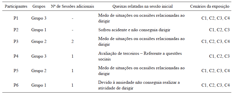 Na sessão de entrevista, os participantes descreveram ter medo de não conseguir controlar o carro e da avaliação de terceiros. Disseram ainda, que sentiam não estar aptos a dirigir. P2 e P3 relataram que isso ocorria desde a aprovação na prova prática do Detran, e que apresentavam comportamentos emocionais diante da situação de ter que dirigir. P6 informou que, apesar de pilotar uma moto, não conseguia sair do lugar com o carro, e quando conseguia conduzi-lo por um pequeno período, ficava muito ansioso e perdia a concentração, o que o levava a não se comportar como deveria. P1, P3 e P5 relataram ter medo de não conseguir controlar o carro e de não conseguir enfrentar as situações difíceis no trânsito. Afirmaram temer paralisar no trânsito ou fazer alguma “besteira”. P4 comentou não ter segurança em dirigir e que se desesperava ao passar por locais onde havia a possibilidade de trânsito intenso, e tinha medo de ser avaliado pelo pai, pelos irmãos ou por outra pessoa no trânsito. Na tabela 1 são apresentados os resumos das queixas, os cenários da exposição e a distribuição dos participantes nos grupos. Na fase de intervenção, apesar de terem sido previstas seis sessões, houve sessões de intervenção adicionais: duas para P3 e uma para P4, P5 e P6. A adição de sessões ocorreu devido à avaliação da pesquisadora, da necessidade de determinadas habilidades (realizar rampa, rotatória, rampa com parada obrigatória) serem mais bem treinadas ou aos pedidos de refazer algum cenário.