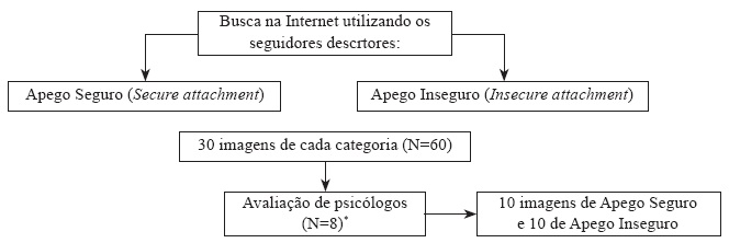 A seleção das imagens relacionadas ao apego foi realizada na internet no banco de imagens com licença aberta do Google®. A opção de busca na internet foi intencional, pois não foram encontradas imagens de apego já validadas para estudos experimentais. A figura 1 ilustra o processo de seleção das imagens.