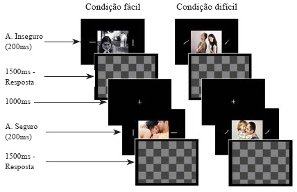 O experimento iniciava com dois blocos de treinamento contendo 20 imagens controle (neutras, sem valência emocional) cada. As imagens neutras foram obtidas no banco de imagens do IAPS —International Affective Picture System— (Lang, 1995). No treino, os participantes recebiam feedback sobre o Tempo de Resposta (TR), a acurácia e ausência de reação. A coleta dos TR dos participantes tinha início depois do bloco de treino, sem feedback. No experimento, havia 4 blocos de 20 imagens cada, dois blocos equilibrados entre imagens neutras e imagens de apego seguro (AS) e dois blocos equilibrados entre imagens neutras e de apego inseguro (AI). Haviam dois modelos, fácil e difícil, sendo que cada um continha um bloco AS e um AI. No modelo fácil havia uma diferença visível entre as barras, de 90º, e no modelo difícil havia uma diferença sútil entre as barras, de 6º. A ordem de apresentação dos 4 blocos foi randomizada entre os participantes. A condição difícil foi inserida na tarefa apenas para manter a atenção do participante e evitar distratores (Lavie, 2005).