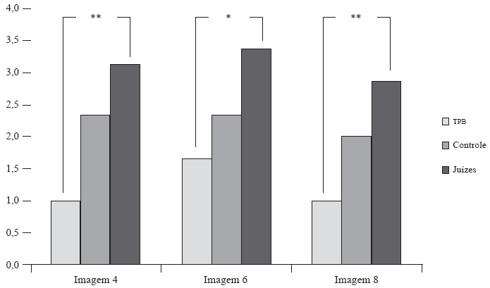 A imagem 6 foi avaliada como diferente entre os grupos, * p < .05. O grupo de TPB avaliou as imagems 4 e 8 como mais indicativas de um apego inseguro que os juízes, ** p < .0025.