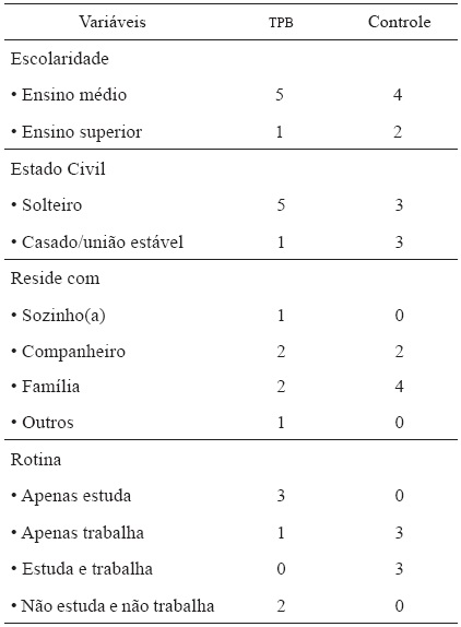 Todos os pacientes com TPB faziam psicoterapia (M = 6.93 anos, DP = 5.567) durante a coleta de dados em 2015, sendo que cinco realizavam também algum tratamento farmacológico concomitante.